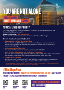 If you see anything that concerns you then please speak to one of our Security staff, call the Estate Control Centre on 020 7418 2606 or email estate.controlcentre@canarywharf.com