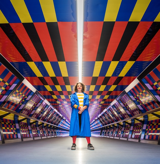 A resident of East London for over 20 years, Walala’s work is right at home in this vibrant area of the capital. The hypnotic design sees Adams Plaza Bridge wrapped in bold geometric shapes and colours. Visitors’ perceptions of the piece will change throughout the day, as daylight and darkness seeps through to alter the visuals inside the structure. Inspired by the architectural details of the striking bridge, Walala’s vision used the tunnel-like form as a canvas to transform the space into an eye-catching backdrop.