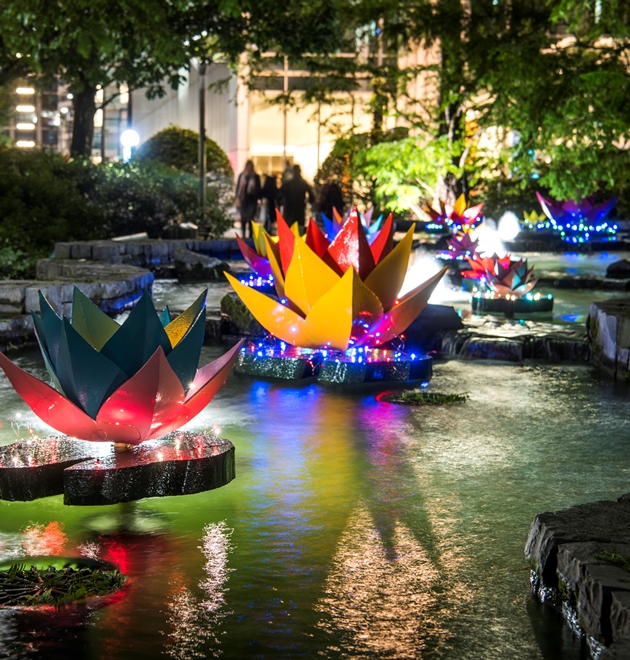 In honour of the event also referred to as the festival of lights, colourful lotus flowers will float along the water fountain that winds through the park, lighting it up in a multicoloured display. Inspired by the Indian artwork of Rangoli and light Divas, each flower will spill shimmering lights into the water as it drifts along.