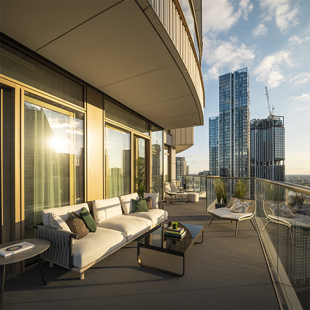 Located on the 32nd storey of One Park Drive, one of London’s most recognisable buildings, the Sky Lofts feature 1,300 sq ft wraparound terraces, providing breathtaking views of the Estate’s other iconic buildings and onwards to most of the capital’s landmarks.