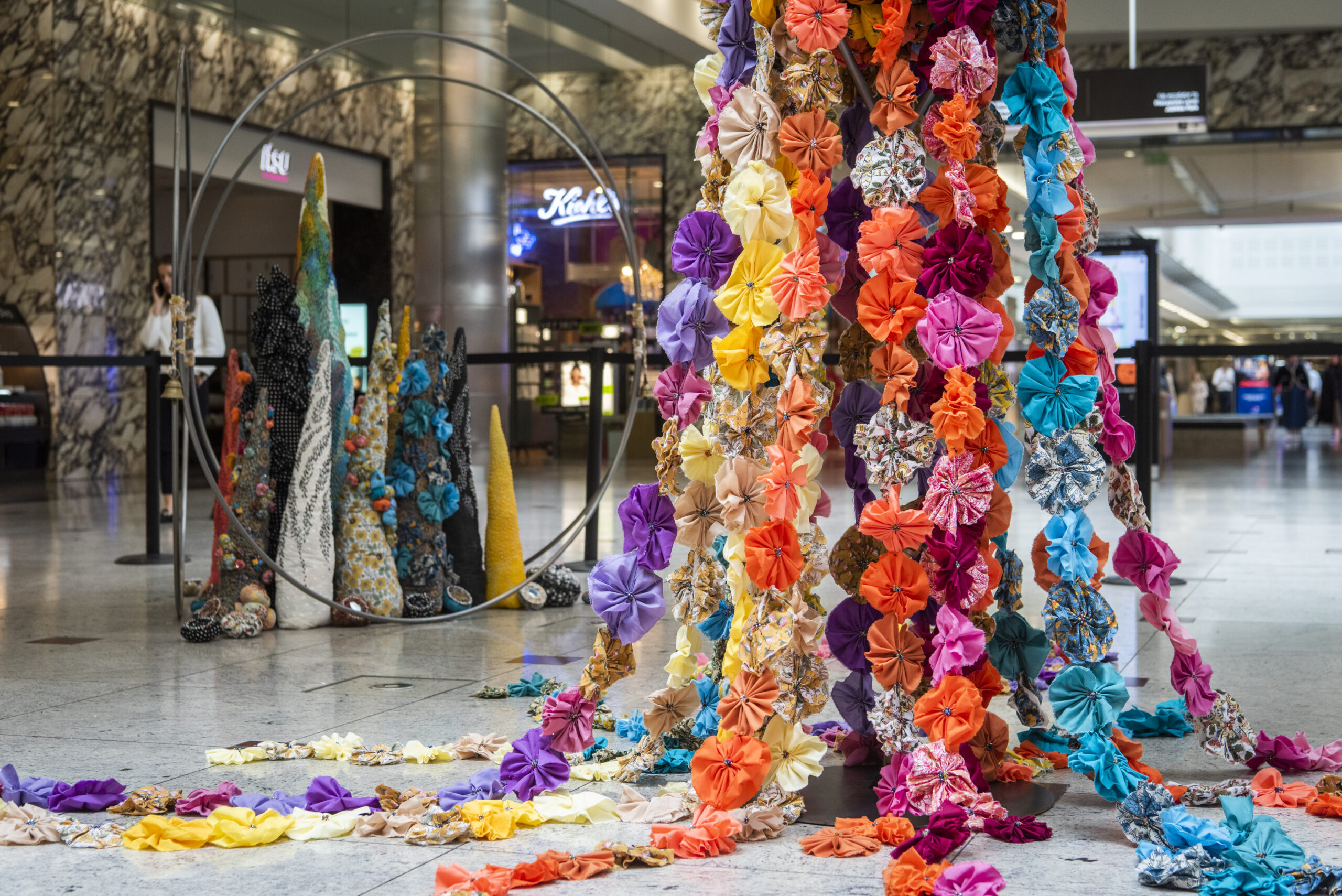 Patel’s installation features intricate, colourful sculptures crafted from traditional Indian materials such as sari fabrics, bells, and glass beads. Each piece reflects the artist’s exploration of themes such as migration, race, identity, and gender, creating an immersive experience that resonates deeply with the festival’s essence.