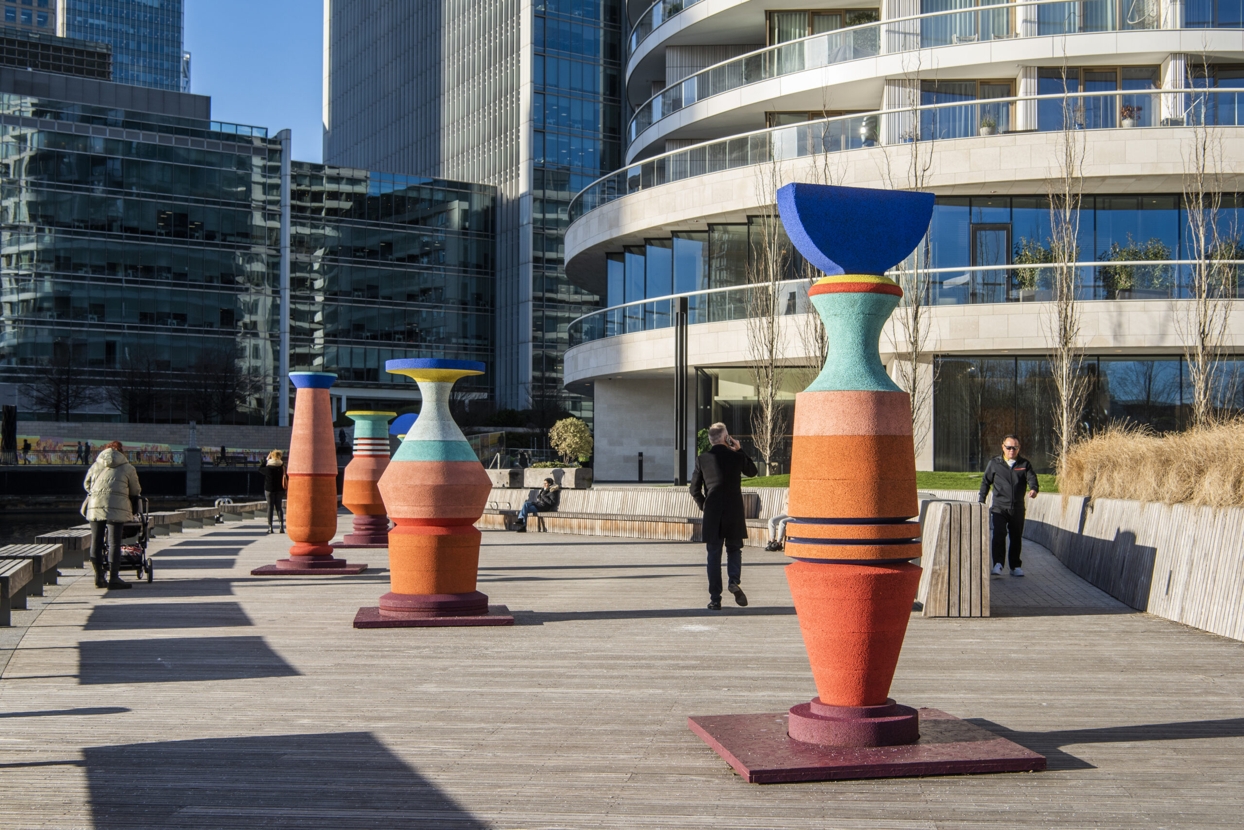 Visitors are invited to explore and enjoy the colourful sculptures from all angles, experiencing the multiple backdrops of greenery, water or the monumental skyline of Canary Wharf. Simone’s latest work is the most recent addition to Canary Wharf’s collection, joining over 100 artworks by renowned artists including Henry Moore, Camille Walala, Helaine Blumenfeld and Yinka Illori.